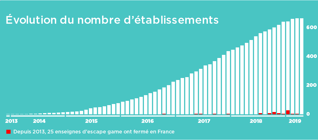 Comme le montre le graphique, la création d’établissements poursuit une très forte croissante, une trop grande croissance ! C’est pour cela qu’on voit déjà, ces dernières années, des établissements obligés de fermer. L’ultra concurrence mène les Escape Game à se livrer une guerre sans merci. Que ce soit une guerre des prix ou celle de l’innovation, beaucoup d’établissements n’ont pas la carrure suffisante pour tenir le rythme et doivent alors mettre la clé sous la porte !